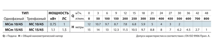 Краткая техническая характеристика насосов серии MC (чугун):