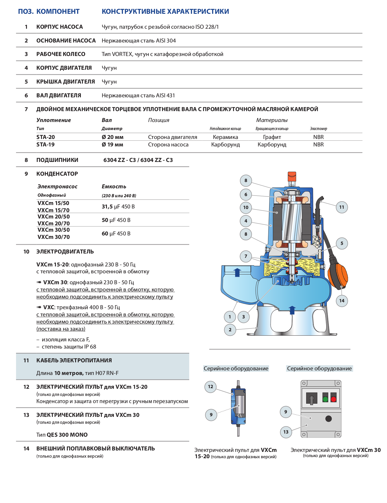 Насосы серии VXC изготовлены из толстостенного чугуна, характеризующегося высокой прочностью, стойкостью к абразивному воздействию и долговечностью. Они оснащены рабочим колесом типа VORTEX, поэтому подходят для дренажа хозяйственно-бытовых сточных вод, канализационной воды, атмосферных сточных вод, взболтанного сырого осадка, гнилостного шлама. Насосы предназначены для установки в канализационных коллекторах, туннелях, котлованах, каналах, подземных автостоянках и т.д.