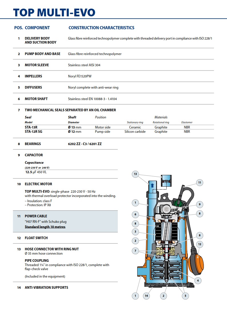 Области применения и установка Насосы TOP MULTI-EVO рекомендуются для перекачивания чистой воды и жидкости, не являющимися химически агрессивными для материалов, из которых изготовлен насос. Благодаря высокой эффективности и надежности они подходят для использование в таких задачах, как водоснабжение из резервуаров, резервуары или относительно глубокие колодцы для забора дождевой воды из цистерн для полива садов или для использования в системах орошения и т. д. Эксплуатационные ограничения